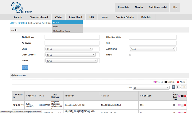 Bir çok İlçe Milli eğitim kurumlarının kullandıgı , üçretlik öğretmenlik ve Norm fazlası yönetim sistemi ,Program hem üçretli öğretmenlik yapmak isteyenleri brans olarak dogru yönlendirmesi ve sisteme web üzerinden basvur